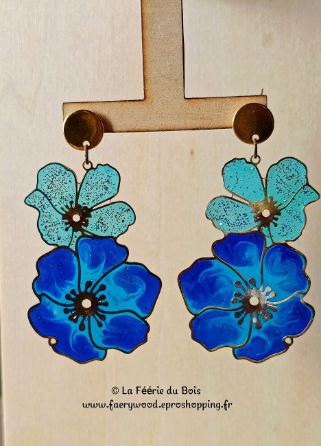 Les Coquelicots bleus #2- Collection Vitrail - Boucles d'Oreilles by La Féérie du Bois - Cadeau Artisanal