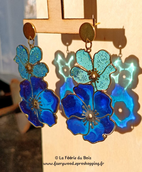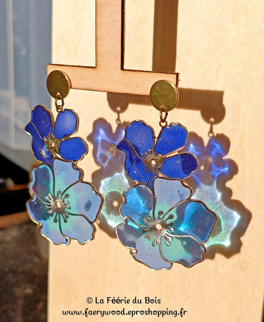 Les Coquelicots bleus #2- Collection Vitrail - Boucles d'Oreilles by La Féérie du Bois - Cadeau Artisanal